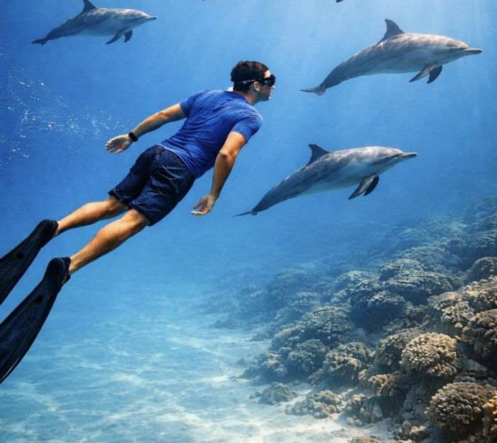 principy freedivingu, vše vás naučí a vy už to pak můžete jen několikrát denně trénovat přímo s delfínky, nebo při potápění u korálů.