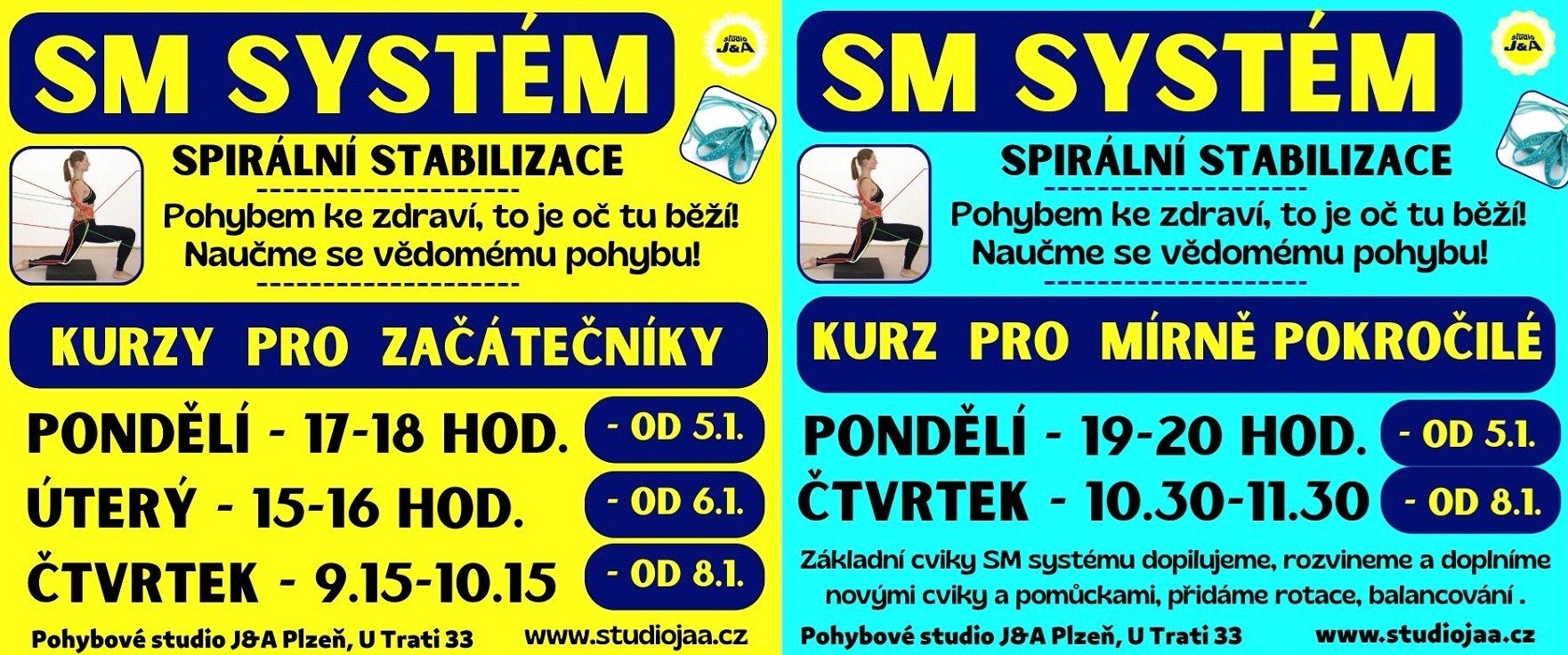 Vítejte na stránkách pohybového studia, které nabízí skupinové lekce nejrůznějších směrů pro všechny věkové kategorie. Vítejte u nás! Nabízíme rodinné prostředí, profesionalitu, moderní pomůcky a respekt k individualitě každého. Máme pro vás zdravý pohyb a těší nás radost z pohybu! V naší nabídce najdete lekce jak pro děti, tak pro dospělé, ženy i muže. Najdete u nás lekce i kurzy od výkonostního charakteru přes rekreační až k relaxačním a zdravotním formám. Nedílnou součástí našeho studia jsou kurzy pro děti od zájmových až po stupně výkonnostního a reprezentačního. Vyberte si, napište, zavolejte - rádi poradíme, těšíme se!