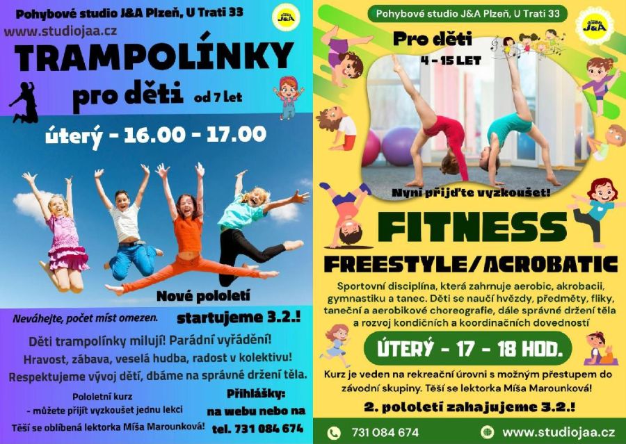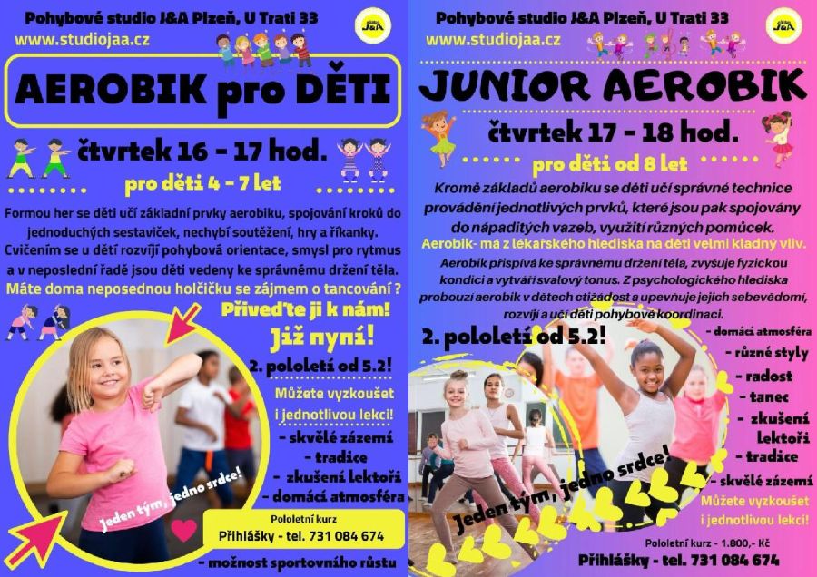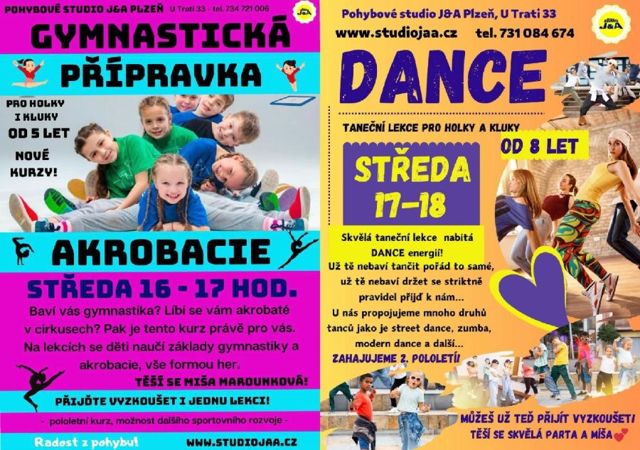 Vítejte na stránkách pohybového studia, které nabízí skupinové lekce nejrůznějších směrů pro všechny věkové kategorie. Vítejte u nás! Nabízíme rodinné prostředí, profesionalitu, moderní pomůcky a respekt k individualitě každého. Máme pro vás zdravý pohyb a těší nás radost z pohybu! V naší nabídce najdete lekce jak pro děti, tak pro dospělé, ženy i muže. Najdete u nás lekce i kurzy od výkonostního charakteru přes rekreační až k relaxačním a zdravotním formám. Nedílnou součástí našeho studia jsou kurzy pro děti od zájmových až po stupně výkonnostního a reprezentačního. Vyberte si, napište, zavolejte - rádi poradíme, těšíme se!